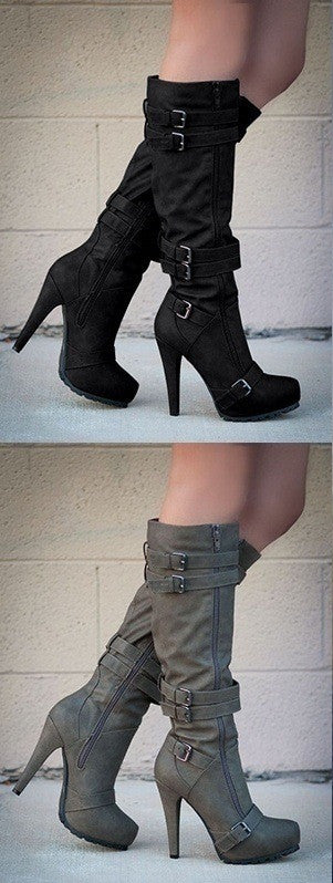 • Kniehohe Stiefel mit markanten Schnallen und Reißverschluss
